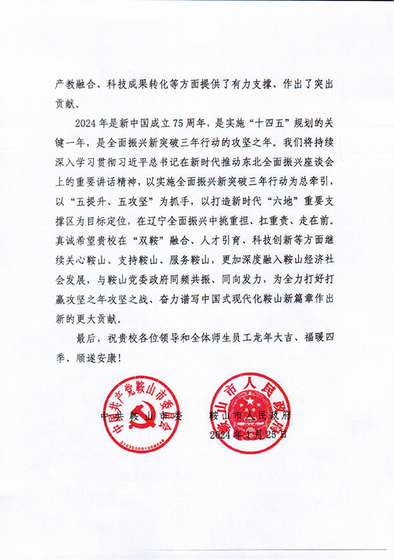 信中强调,2023年是鞍山发展史上极具挑战的一年,也是富有成效的一年。鞍山市委、市政府坚持以习近平新时代中国特色社会主义思想为指导,深入贯彻落实习近平总书记关于东北、辽宁振兴发展的重要讲话和指示批示精神,聚焦省委全面振兴新突破三年行动这一中心任务,全市各项工作呈现多年来少有的良好局面,取得全年GDP突破2000亿元的历史性成就,实现三年行动首战告捷。